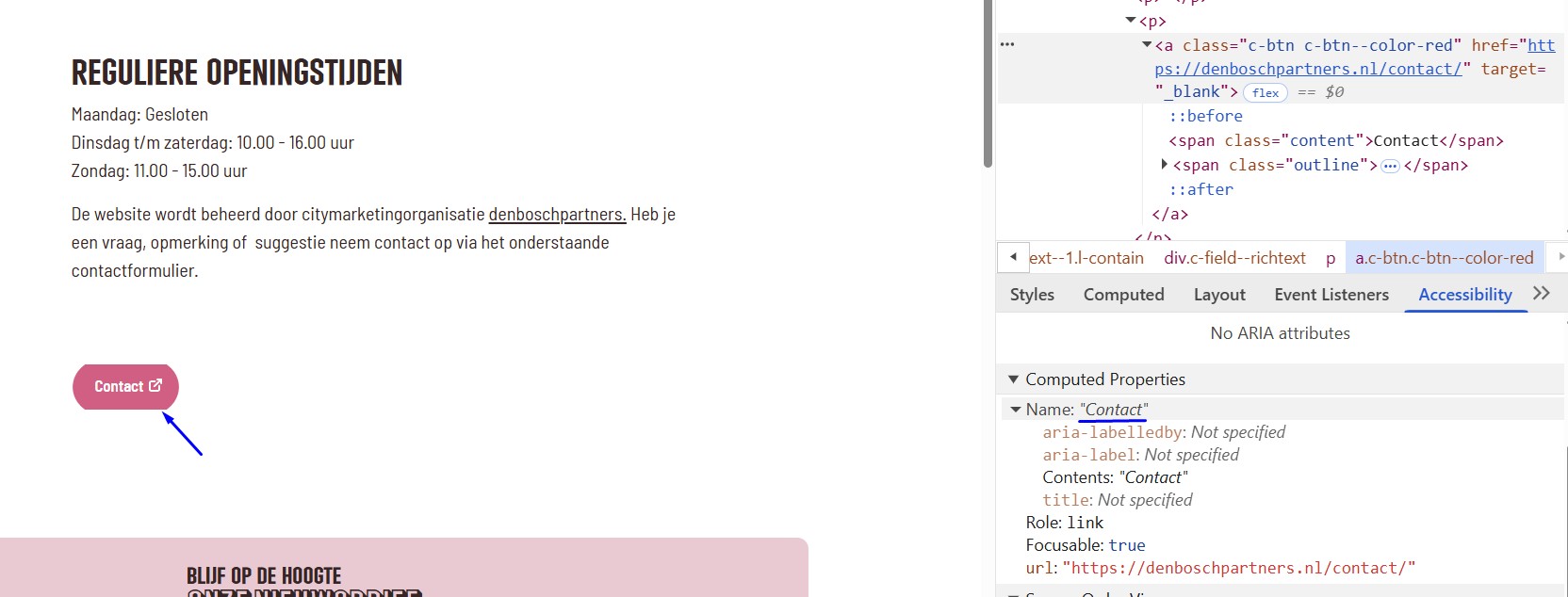 Op deze pagina, onder de kop “Reguliere openingstijden”, staat een link met de witte tekst “Contact” op een roze (#D95D82) achtergrond. De kleurcontrastverhouding is te laag: 3,6:1.