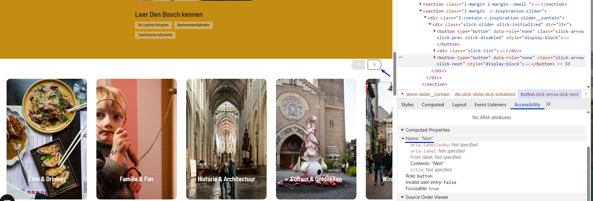 De carrousel heeft knoppen om tussen afbeeldingen te navigeren. Deze knoppen voldoen niet aan de minimale afmetingseisen voor interactieve elementen. De gecombineerde hoogte, breedte en omringende ruimte van elke knop is minder dan 24 CSS-pixels.