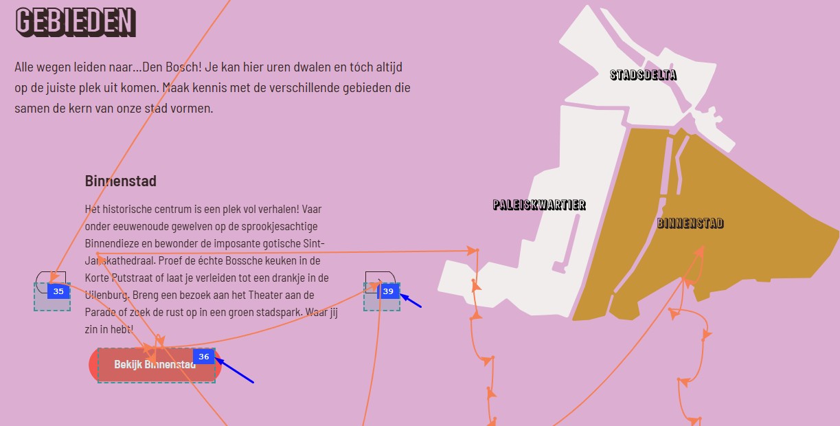 Daarnaast staat de witte tekst ‘Natuur in Den Bosch’ op een groene achtergrond (#58E8A4). Ook hier is de kleurcontrastverhouding te laag: 1,6:1. Hetzelfde probleem doet zich voor bij de witte tekst ‘Blijven slapen’ op een lichtblauwe achtergrond (#A2D4FC), met een contrastverhouding van 1,6:1.