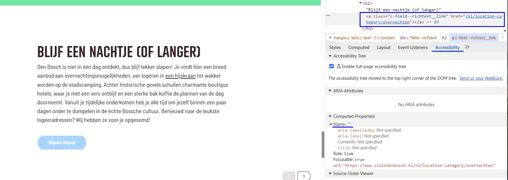 Op deze pagina ontbreekt naast de kop "Blijf een nachtje (of langer)" een toegankelijke naam bij een link. Hierdoor begrijpen bezoekers die een schermlezer gebruiken niet wat de bestemming of de bestemming is van de link.