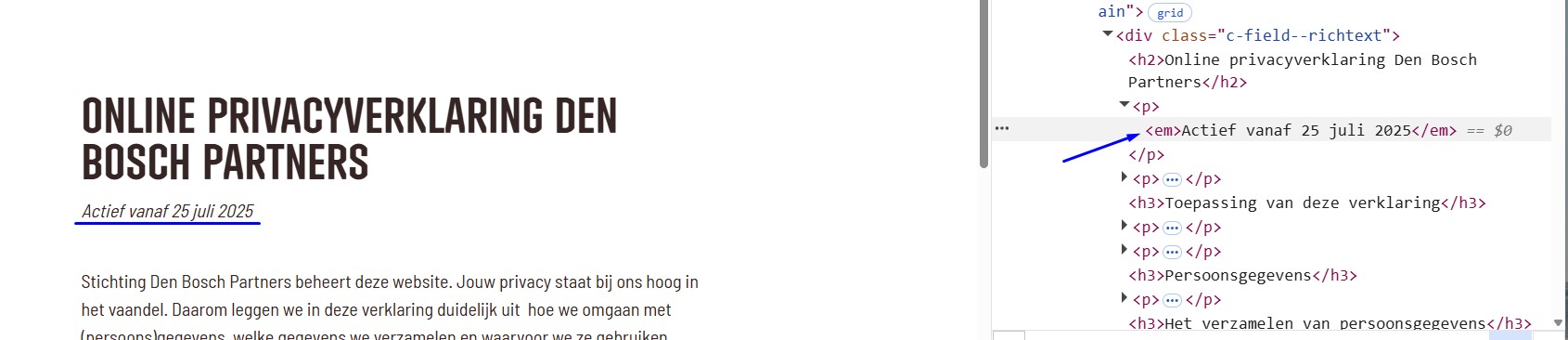 Op deze pagina onder de kop "Online privacyverklaring Den Bosch Partners" wordt het em-element ten onrechte gebruikt voor stylingdoeleinden.