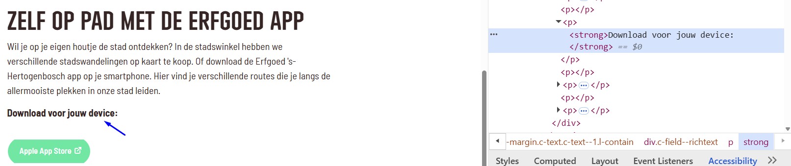 Op deze pagina is de tekst "Download voor jouw device:" een kop, maar het h-element ontbreekt. Er wordt een strong-element gebruikt om het op een kop te laten lijken.
