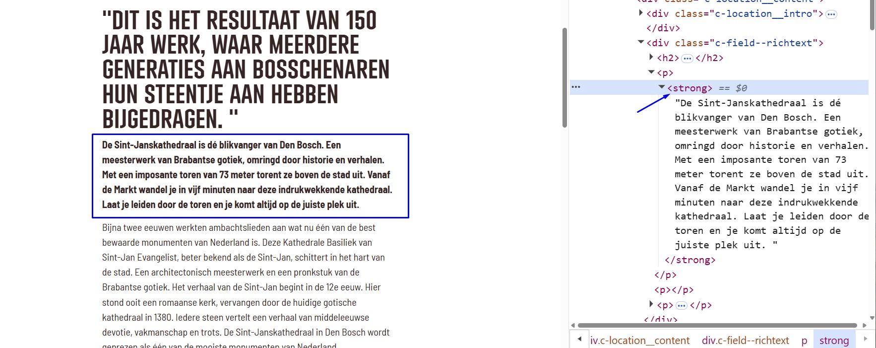 Op deze pagina wordt onder de kop “Dit is het resultaat van 150 jaar werk, waar meerdere generaties aan Bosschenaren hun steentje aan hebben bijgedragen.” het strong-element ten onrechte gebruikt voor stylingdoeleinden. Volledige alinea is opgenomen in een strong-element om het vetgedrukt weer te geven.