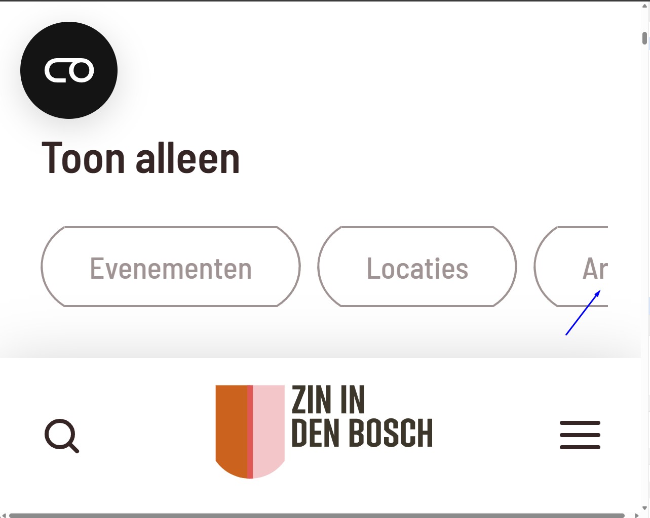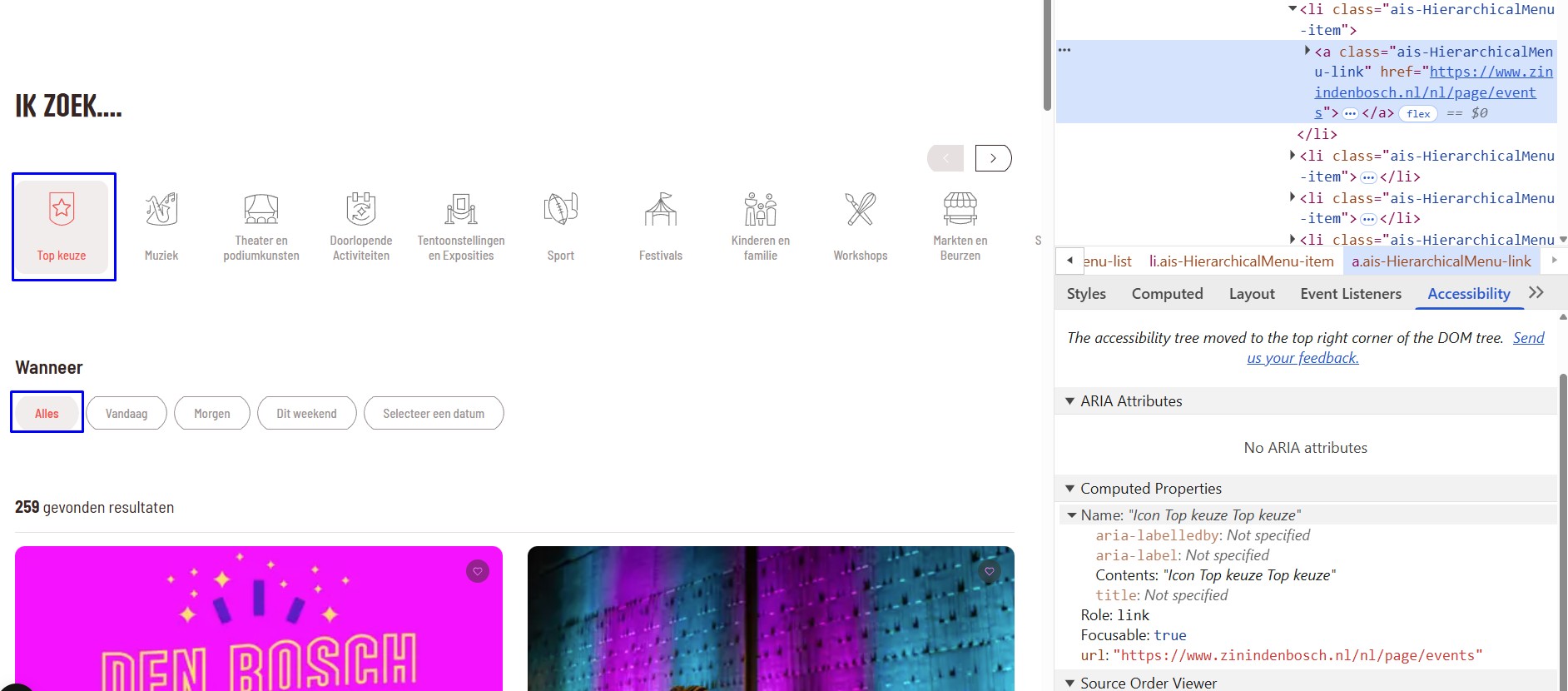 Hetzelfde probleem doet zich voor op andere pagina's met filters, bijvoorbeeld https://www.zinindenbosch.nl/nl/page/events en <https://www.zinindenbosch.nl/nl/page/locations
