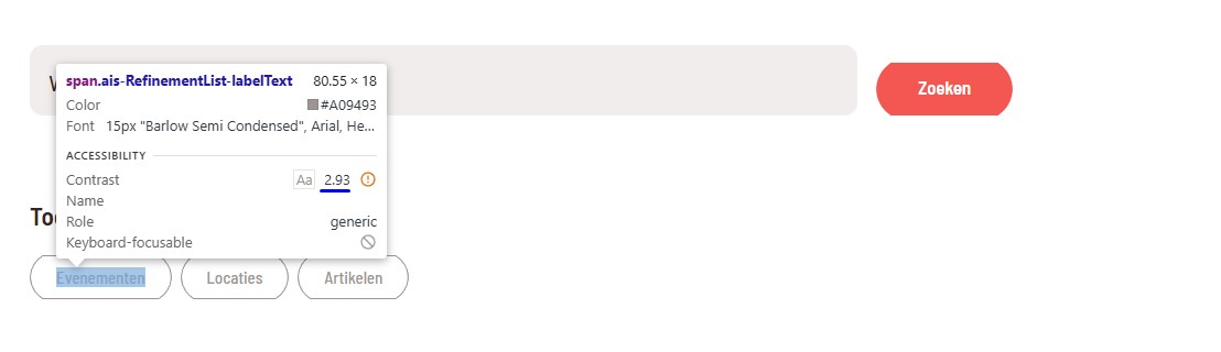 Onder de kop 'Toon alleen' staan knoppen met een grijze (#A09493) tekst 'Evenementen', 'Locaties' en 'Artikelen' op een witte achtergrond. De kleurcontrastverhouding is te laag: 2,9:1. Wanneer de muisaanwijzer op de knoppen wordt geplaatst of wanneer ze worden geselecteerd, verandert de tekstkleur in rood (#FF544D) tegen een grijze achtergrond (#F3EDED). De resulterende contrastverhouding is 2,7:1.